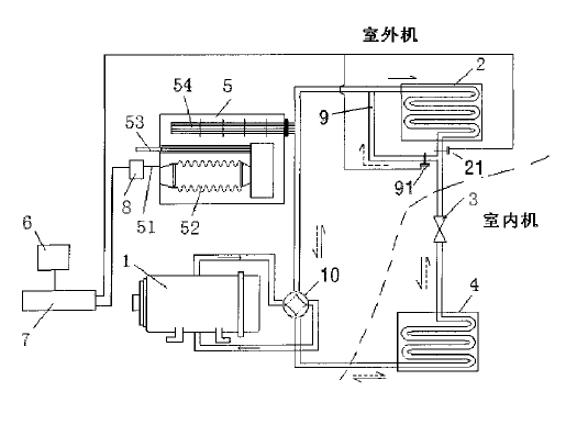 本發(fā)明公開了一種制冷、制熱的雙能源燃氣熱泵空調(diào)系統(tǒng)及運行方法,包括熱泵系統(tǒng),還包括一真空鍋爐換熱裝置、一溫度傳感器、以及一切換電路;真空鍋爐換熱裝置設(shè)置在室外,通過管道連接在熱泵系統(tǒng)的壓縮機和第一熱交換器之間,與其他部件處于同一循環(huán)系統(tǒng)中;溫度傳感器設(shè)置在室外,該溫度傳感器的輸出端與切換電路的輸入端電連接;切換電路根據(jù)溫度傳感器輸出的溫度信號控制真空鍋爐換熱裝置和第一熱交換器的交替啟閉。當(dāng)室外溫度降到設(shè)定溫度以下時,真空鍋爐裝置制熱,從而徹底解決了普通熱泵系統(tǒng)在冬天低氣溫的時候室外機從空氣中吸熱效率低下、以及結(jié)霜導(dǎo)致系統(tǒng)無法運行的問題。具有效率高、制熱效果好和降低用電高峰時電力系統(tǒng)的壓力的優(yōu)點。 |