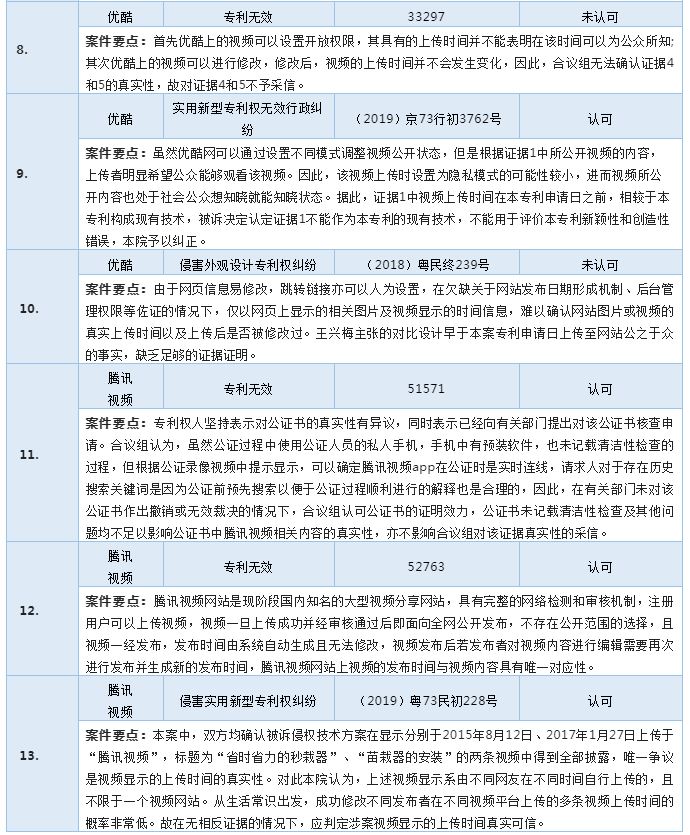 相較于社交平臺類網(wǎng)絡(luò)證據(jù),視頻流媒體類網(wǎng)絡(luò)證據(jù)因其獨特的形式往往蘊含更為豐富的有效信息,并且能夠讓人更為直觀的理解目標信息。對于視頻流媒體類網(wǎng)絡(luò)證據(jù)的認定規(guī)則與社交平臺類網(wǎng)絡(luò)證據(jù)較為相似,考量的重點不外乎真實性,公開性以及公開時間,但因視頻流媒體平臺的相關(guān)隱私權(quán)限規(guī)則及修改規(guī)則較為隱蔽,需要針對平臺規(guī)則進行詳細解釋說明。同時應(yīng)當注意的是,在實踐中由于部分企業(yè)存在產(chǎn)品宣傳先行,專利申請滯后的情況,相關(guān)視頻的發(fā)布者往往是專利權(quán)人或其關(guān)聯(lián)主體。在此種情形下,應(yīng)當著重審核發(fā)布主體的身份用以輔助參考證據(jù)的真實性及公開性。下表是認定視頻流媒體類網(wǎng)絡(luò)證據(jù)的案例梳理。