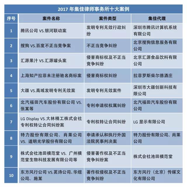 集佳律師事務(wù)所十大知識(shí)產(chǎn)權(quán)典型案例已經(jīng)連續(xù)評(píng)選了四年,案例評(píng)選委員會(huì)本著客觀、中立的原則,經(jīng)過初選、復(fù)選以及評(píng)議,參考最高人民法院及全國各地法院評(píng)選的十大知識(shí)產(chǎn)權(quán)案件,最終從2017年度集佳代理的三百多件訴訟案件中篩選出了十件典型案件,該十件案件涉及專利侵權(quán)與無效、商標(biāo)侵權(quán)、商標(biāo)授權(quán)確權(quán)、互聯(lián)網(wǎng)不正當(dāng)競爭、著作權(quán)及涉外判決的執(zhí)行等領(lǐng)域,具有較強(qiáng)的法律適用的典型意義和較大的社會(huì)影響,充分地體現(xiàn)了國內(nèi)司法保護(hù)的良好局面,也展現(xiàn)出了訴訟代理團(tuán)隊(duì)的專業(yè)水準(zhǔn),同時(shí)也為與之類似的案件提供了可資借鑒的先例范本。以下為2017年度集佳律師事務(wù)所十大案件名錄: