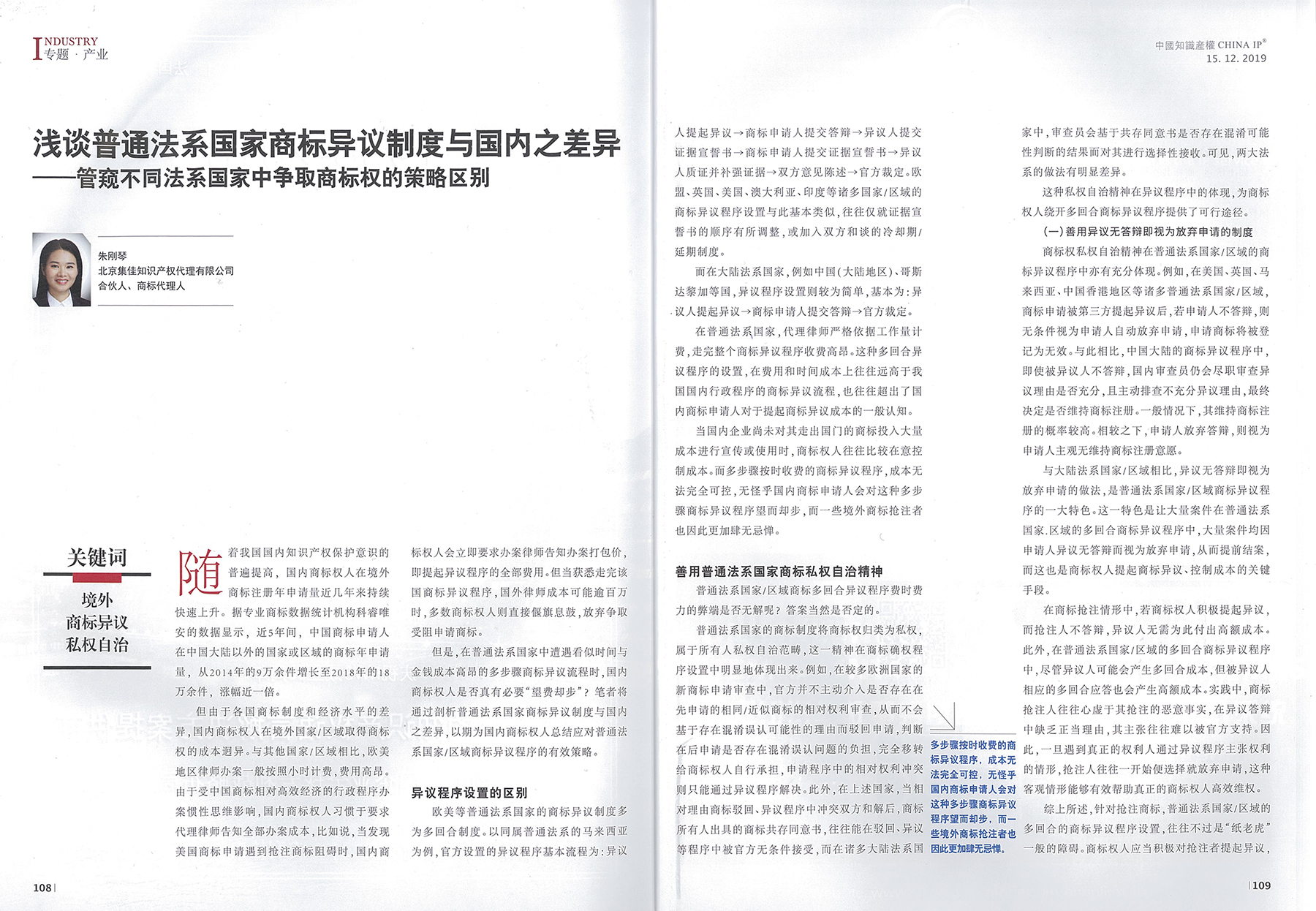 集佳文章《淺談普通法系國家商標(biāo)異議制度與國內(nèi)之差異——管窺不同法系國家中爭取商標(biāo)權(quán)的策略區(qū)別》在《中國知識產(chǎn)權(quán)》發(fā)表