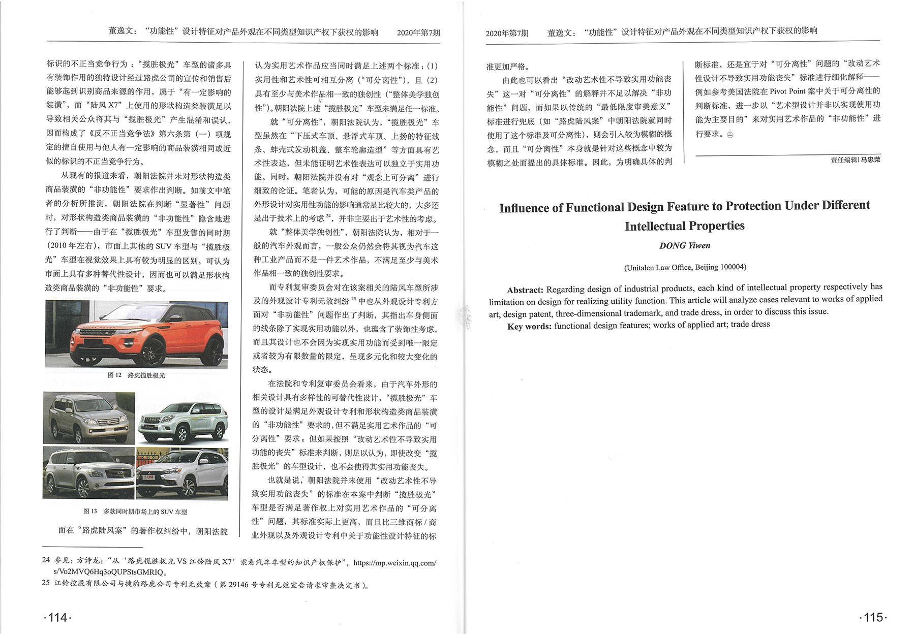 集佳文章《“功能性”設(shè)計(jì)特征對(duì)產(chǎn)品外觀在不同類型知識(shí)產(chǎn)權(quán)下獲權(quán)的影響——從“路虎陸風(fēng)”之爭(zhēng)說(shuō)起》在《中國(guó)發(fā)明與專利》發(fā)表