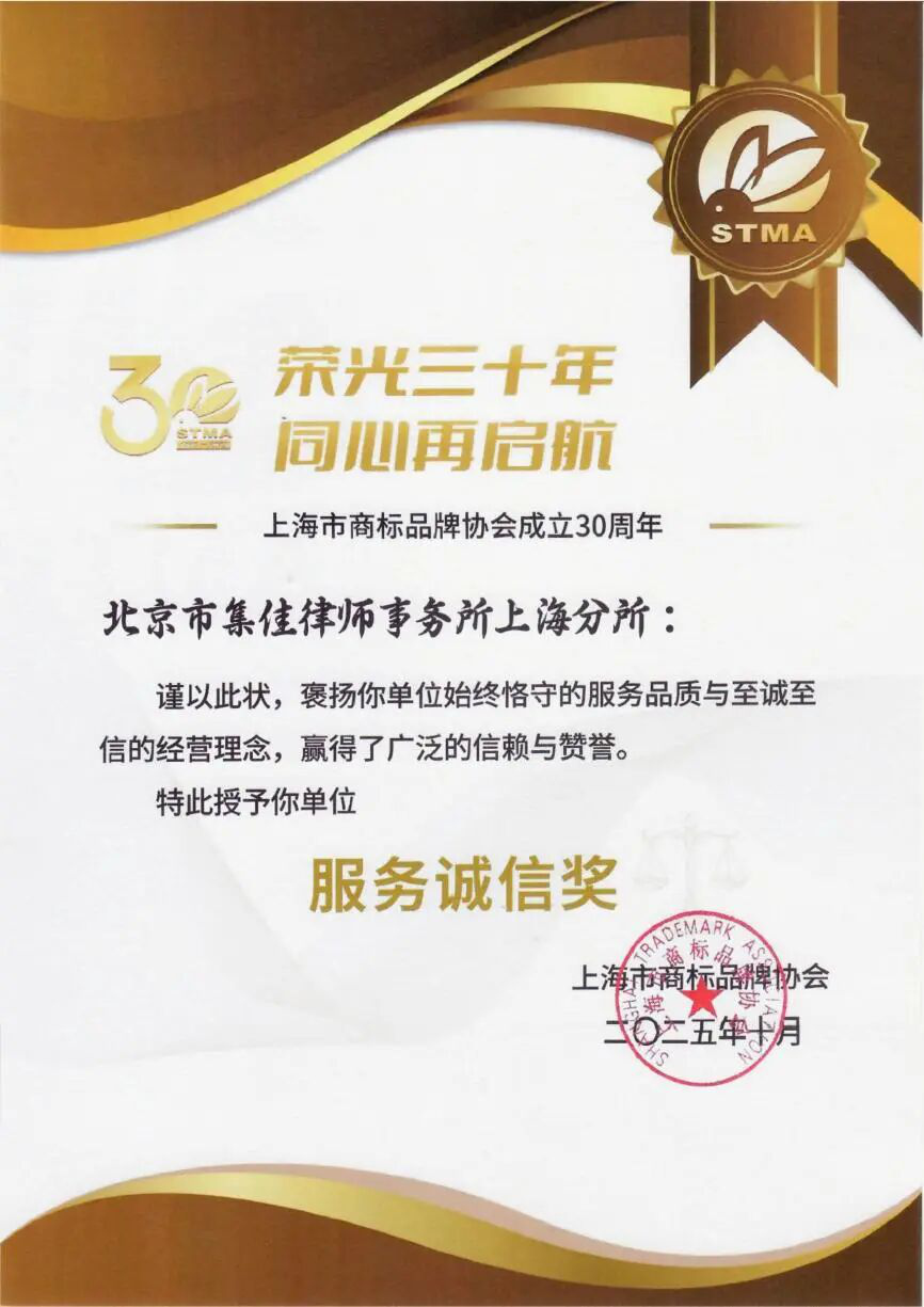 這些榮譽,既是肯定,更是前行的號角。展望未來,集佳上海分所將以此為勵,秉持“客戶至上”的初心,在專業(yè)領(lǐng)域深耕不輟,持續(xù)深化專業(yè)知識,優(yōu)化服務(wù)流程與體驗。我們期待與上海市商標品牌協(xié)會、業(yè)界同仁及所有信任我們的客戶攜手同行,共同推動中國商標品牌事業(yè)邁向更加繁榮的明天。