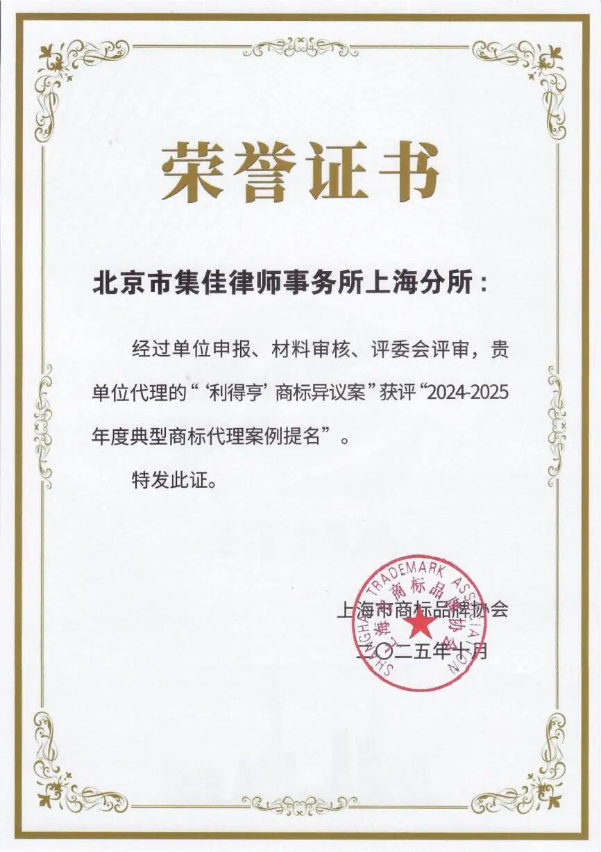 ★ 集佳上海分所辦理的“‘利得亨’商標異議案”獲評“2024-2025年度典型商標代理案例提名”