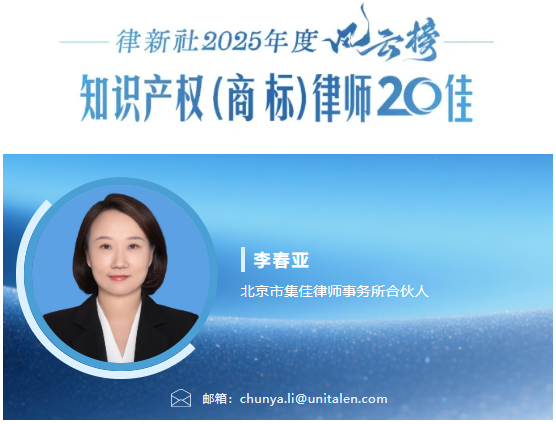 2025年10月22日,律新社重磅發(fā)布“律新社2025年度風(fēng)云榜:知識產(chǎn)權(quán)(商標(biāo))律師20佳”榜單,集佳合伙人李春亞律師憑借在知識產(chǎn)權(quán)領(lǐng)域精湛的專業(yè)實力、杰出的業(yè)績表現(xiàn)及良好的客戶口碑,榮登20佳榜單!